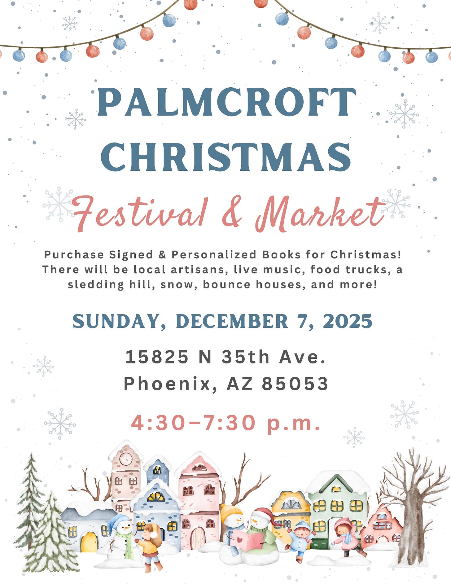I love attending bookish events during the Christmas season. Thereās no better gift for a reader than a personalized and signed book wrapped under the tree. If youāre local to the Phoenix area, I would love for you to stop by my booth at the Palmcroft Christmas Festival & Market on Sunday, December 7, from 4:30ā7:30 p.m. Iāll be selling signed copies of all my books at the event. They will also have other local artisans, live music, food trucks, a sledding hill, snow, bounce houses, and more!